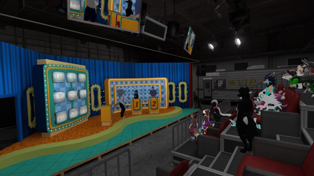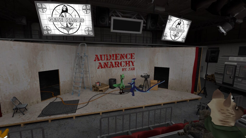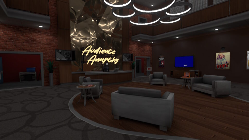 - RobertWK’s Review: Audience Anarchy is a world that requires a lot of people to be a good time. It’s a party “game” where the focus is to entertain each other through improvisation, both literary and theatrical. It has a wide variety of pre-scripted stories and sets that anyone can act out and contribute to in a way that flexes your own style. The execution of feeding lines to the people who choose to be actors is excellent and intuitive, allowing them to flex their skills on stage. There isn’t a requirement for people to participate, but in general the roles of host, actors, and writers are needed for every scene. If you have a diverse collection of avatars, this is the perfect opportunity to show them off.