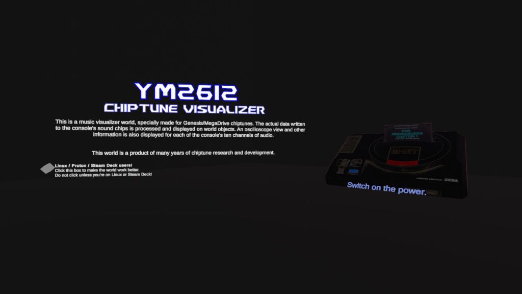 - Katchy’s Review: Love this world! Being able to see FM synthesis in action is neat, and the track selection is among the best the Genesis/Megadrive has to offer. I love that you can not only see the various channels waveforms in action, but the notes being played as well. It’s almost hypnotic. Shout out to the demoscene tracks – those really showcase the potential of the Genesis sound chip. There are a few different toys to play with here as well making it a fun destination for friends to hang out.
