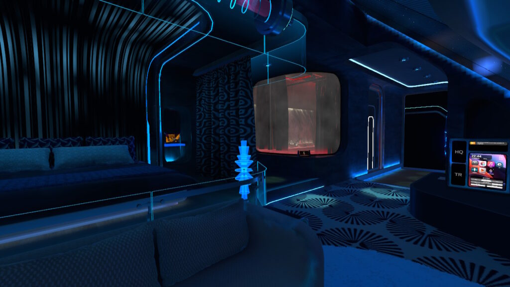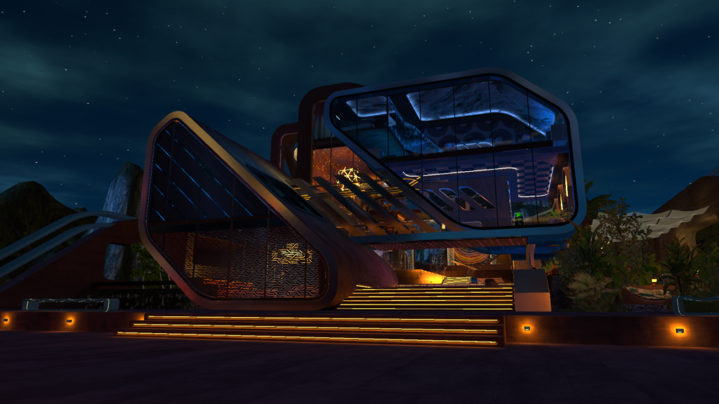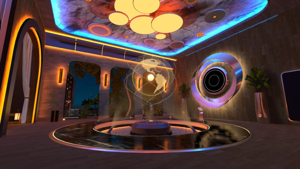 - Katchy’s Review: This world is great for big hangouts with a lot of people as there are a lot of different rooms and areas to chill, each one with a unique vibe. The house itself has a modern art deco feel to it and is surrounded by natural mountains and lots of water, which makes it pretty unique as a lot of hangout worlds just have a simple skybox around a floating house. Perfect for any time of the year!