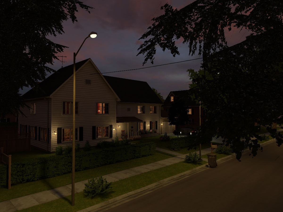 An uncanny valley experience of a segment from a hypothetical suburb of the United States at night.